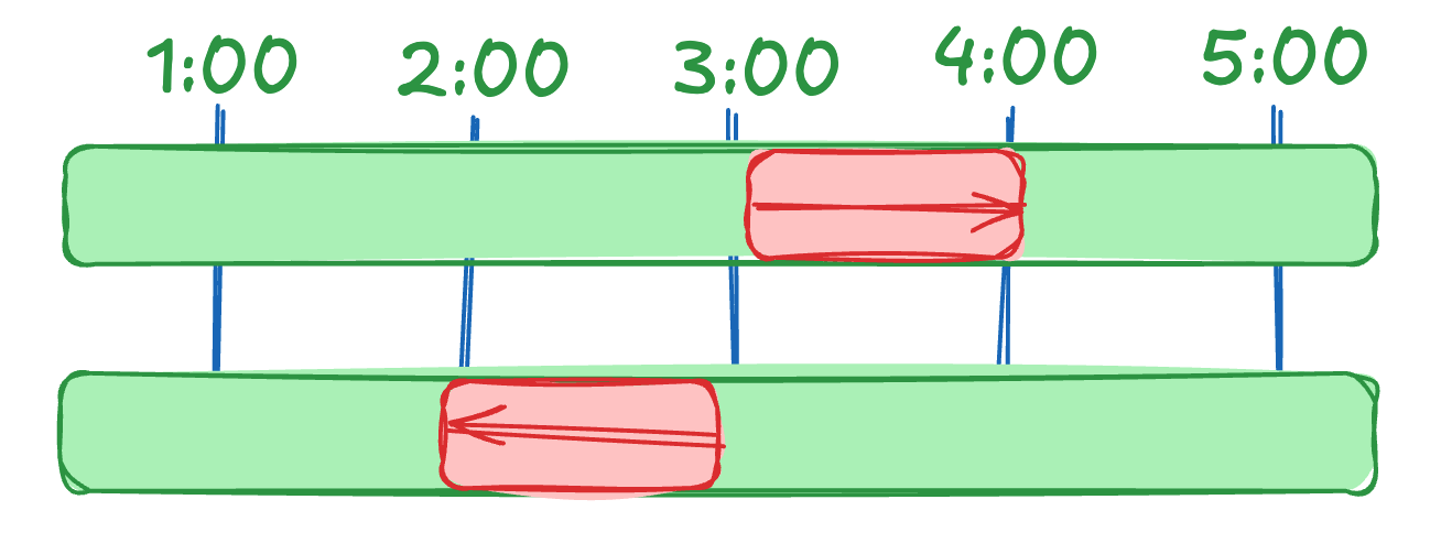 Pirmajā gadījumā, pagriežot laiku pat stundu uz priekšu, vajadzētu izkrist tiem ieplānotajiem darbiem, kuriem bija starp trijiem un četriem? Otrajā gadījumā — vai, pagriežot atpakaļ, darbi, kuri ieplānoti starp diviem un trijiem, izpildās atkārtoti?